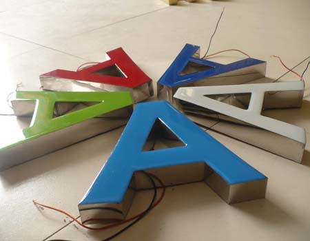 不锈钢灯箱发光立体字是由亚克力发光字箱体和LED光源组成。首先电脑雕刻机把亚克力字形和围边雕刻出来,用粘接剂把亚克力字面与围边粘接在一起,接成箱体, 底板用等离子切割或雕刻机切割而成。 其内部置入LED灯光源组合而成, 一次成型,不用修边,不用打磨,外观精美,表面光亮如镜, 夜晚亮灯立体感强。